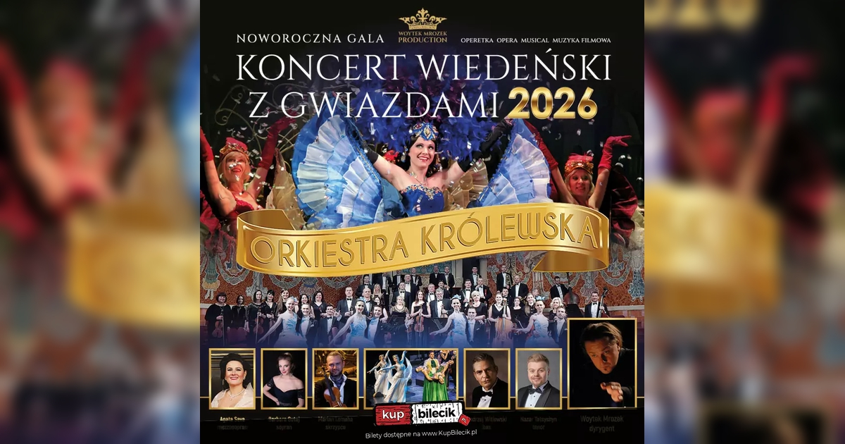 Wracamy i zapraszamy Państwa w podróż do roztańczonego, magicznego Wiednia oraz energetycznego Nowego Jorku, gdzie będą rozbrzmiewać najpiękniejsze arie, duety, walce i polki Johanna Straussa, Franca Lehara, Imre Kalmana a także największe szlagiery musicalowe, filmowe i światowe przeboje wszech czasów. Tegoroczny koncert w wykonaniu światowej. W programie udział wezmą międzynarodowi artyści - znani polskiej i międzynarodowej publiczności a wśród Agata Sava mezzosopran - solistka opery w Pradze, która koncertuje aktywnie na scenach całego świata takich jak: Chicago Philharmonic Hall, Filharmonia Narodowa w Warszawie, Lucerne Concert Hall i wiele innych. Jest absolwentką Hohschule fur Musik w Monachium. Barbara Gutaj sopran, solistka Teatru Wielkiego w Poznaniu, wyróżniona prestiżową Teatralną Nagrodą Muzyczną im. Jana Kiepury w kategorii "Najlepszy Debiut" za debiut na deskach Mazowieckiego Teatru Muzycznego. Debiut w Teatrze Wielkim Poznaniu miał miejsce podczas premiery "Fausta" A. Radziwiłła w reżyserii Adama Hanuszkiewicza, gdzie jej rolę Małgorzaty Józef Kański w "Ruchu muzycznym" określił jako "operowe odkrycie sezonu". Nazar Tatsyshyn - tenor niezaprzeczalnym numerem jeden wśród tenorów młodego pokolenia. Solista obdarzony pięknym głosem śpiewającym w najlepszej tradycji włoskiego Bel Canta jest solistą Opery Narodowej w Budapeszcie. Andrzej Witlewski aktor, wokalista - bas od lat współpracuje z wieloma instytucjami kultury polskiej. Koncert uświetni swoim udziałem niezwykły wirtuoz skrzypiec Marjan Lomaha, który ostatnie 3 lata spędził w Japonii koncertując w każdej sali koncertowej tego kraju. Lomaha koncertował również m.in.: w Filharmonii Berlińskiej, Concertgebow w Amsterdamie, w lipskim Gewandhaus. W tym roku wystąpi w Polsce. W jego wykonaniu usłyszymy wirtuozowskie parafrazy ze Skrzypka na dachu, Czardasza Montiego, utwory z repertuaru Roby Lakatosa. Całość koncertu poprowadzi znany światowej publiczności dyrygent i wirtuoz klarnetu Maestro Woytek Mrozek, który aktywnie koncertuje na całym świecie. "..Mrozek należy do grona poszukiwanych na świecie artystów..." napisała Süddeutsche Zeitung w Monachium. Artysta słynie z niekonwencjonalnych pomysłów i nieposkromionej wyobraźni. Artyści przeniosą słuchaczy do ojczyzny walca prezentując niezwykły kunszt wokalny i instrumentalny. Ta niezwykła gala będzie wzbogacona wirtuozerskim tańcem par tanecznych, barwnymi kreacjami i bogatą choreografią, co pozwoli na doświadczenie wielu doznań artystycznych w iście książęcym stylu. Pary taneczne to soliści Narodowego Teatru Opery i Baletu we Lwowie. W ten magiczny wieczór zabrzmią największe przeboje Króla walca Johanna Straussa takie jak uwertura z Zemsty Nietoperza, Keiser Marsz, Marsz Radezki, walc "Nad pięknym modrym Dunajem", "Odgłosy wiosny" a także polki Trich Trasch, Eljen Magiar Polka, Anne Polka, Gromy i Błyskawice i wiele innych orkiestrowych szlagierów. Nie zabraknie także popisowych arii i duetów z najsłynniejszych operetek: Zemsty Nietoperza, Barona Cygańskiego, Księżniczki Czardasza, Hrabiny Maricy, Wesołej Wdówki czy Krainy Uśmiechu. Publiczność wysłucha między innymi: arie "Adeli", "Czardasz Sylvi", kuplety Barinkaya "Wielka sława to żart", "Graj Cyganie", " Artystki z Variete", "Brunetki Blondynki" a także duety wszechczasów, m.in. "Usta milczą dusza śpiewa", "Jakże mam Ci wytłumaczyć", " Jedź do Verasdin", " Co się dzieje oszaleję", "W rytm walczyka", "Tłumy Franków" z Księżniczki Czardasza. Nie zabraknie także sztandarowych pieśni neapolitańskich takich jak: "Funikuli-Funikula", "O Surdato N'namurato". W drugiej części koncertu artyści zaprezentują się w repertuarze musicalowym, filmowym i światowych przebojów m.in.: "Za Tobą pójdę jak na bal" - K. Krawczyka, "Wielka Miłość" - S. Krajewskiego, "Delilah" - T. Jonsa, "Nella Fantasia" z filmu Misja, "New York-New York" - F. Sinatry, "Volare", "O sole mio" - w wersji E. Presleya, "Przetańczyć całą noc" z musicalu My Fair Lady, "Gdybym był bogaczem" z musicalu Skrzypek na dachu i wiele innych noworocznych, muzycznych niespodzianek.