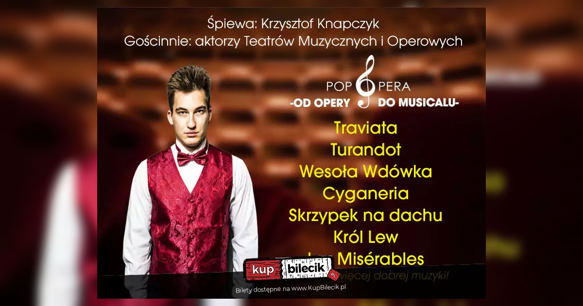 Zapraszamy na muzyczne widowisko, które zabierze Państwa w niezwykłą podróż - od wzruszających arii operowych, przez porywające hity musicalowe, aż po kultowe utwory muzyki rozrywkowej. Pop Opera - Od Opery do Musicalu to wydarzenie, które za każdym razem zaskakuje czymś nowym. Muzyka połączy pokolenia. Najpiękniejsze arie operowe i ponadczasowe przeboje musicalowe w mistrzowskim wykonaniu solistów Teatrów Muzycznych i Operowych. Na scenie pojawią się artyści, którzy oczarowali publiczność na światowych scenach - w tym tenor Krzysztof Knapczyk, znany z niezwykłej ekspresji i głosu, który zapada w pamięć.
